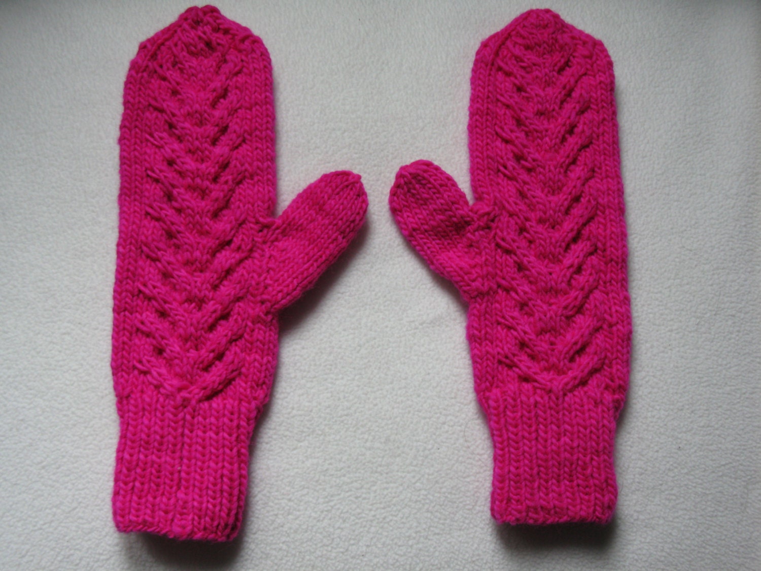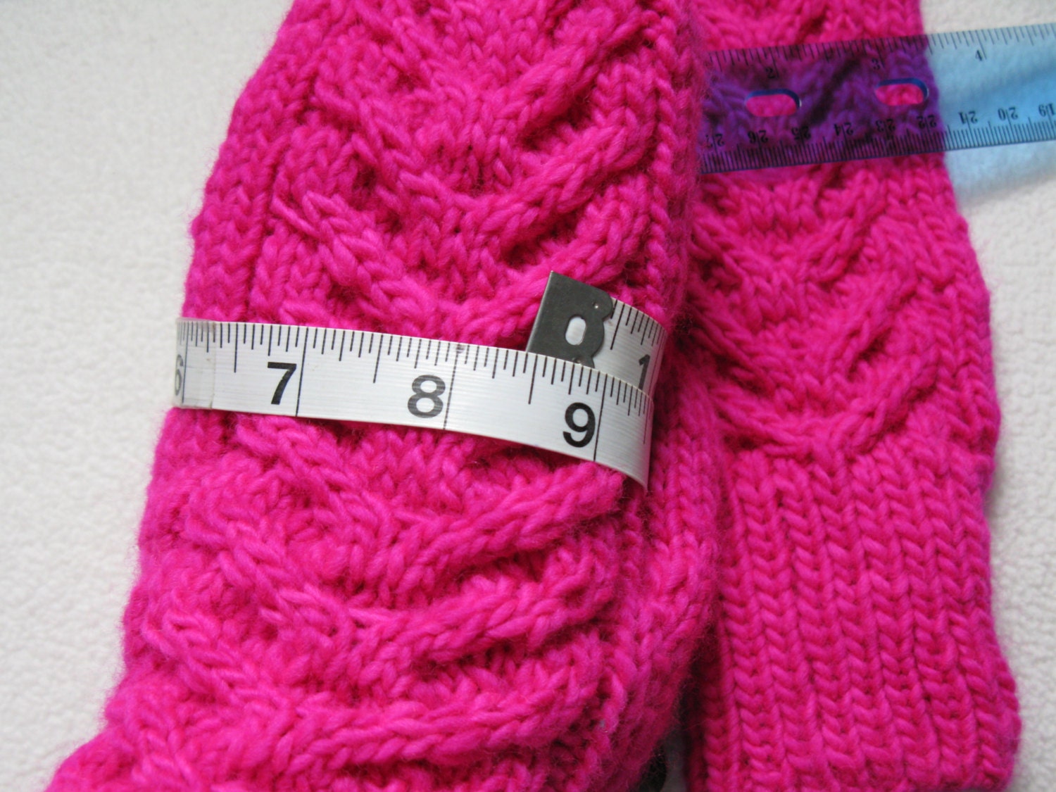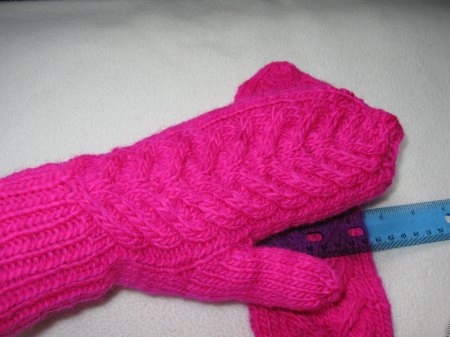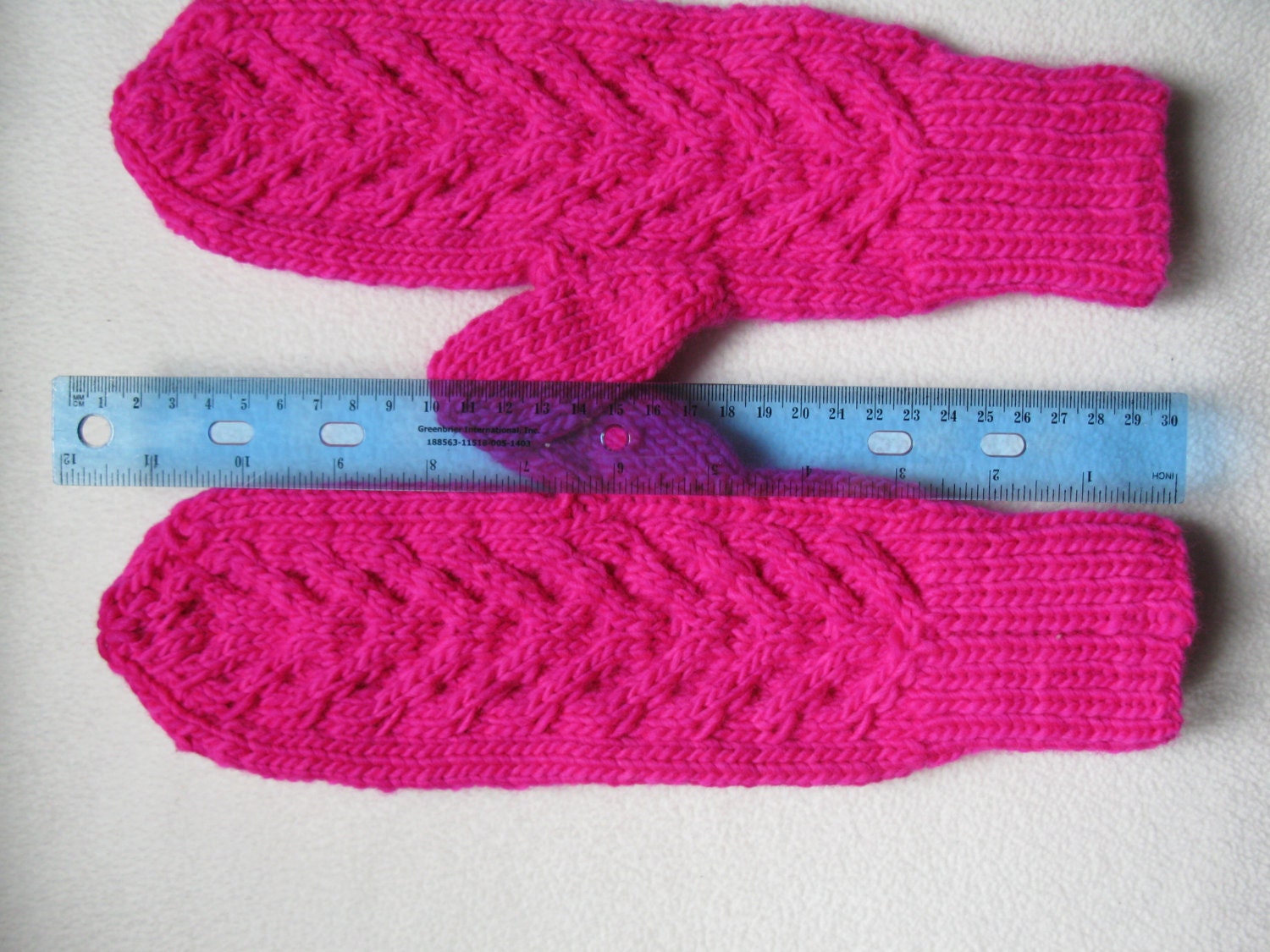 I handknit these warm, super soft mittens with love from 100% merino wool that was hand dyed a tonal hot pink color. These are an adult medium, glove size 8 – 8.5 (average woman). They feature a cable motif on the back of the hand.