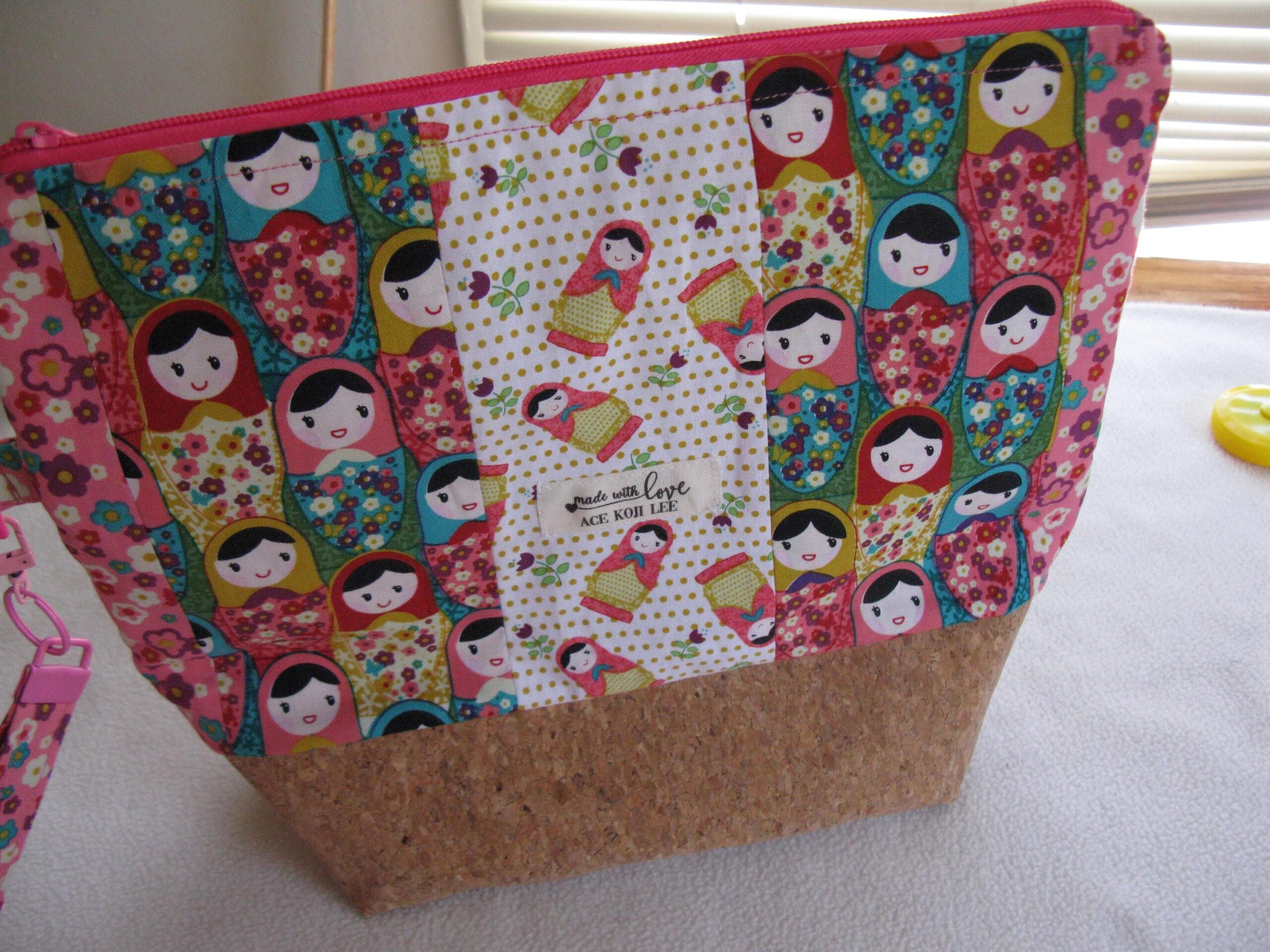 The outside of this bag is made of multiple coordinating cotton fabrics featuring Matryoshka dolls, and natural colored cork fabric. The inside is a plain white cotton fabric. It features a coordinating zipper and wrist strap. At the widest parts it is about 12.5″ x 10.5″ x 4.75″ Great for use as a project bag or whatever you need a bag for.