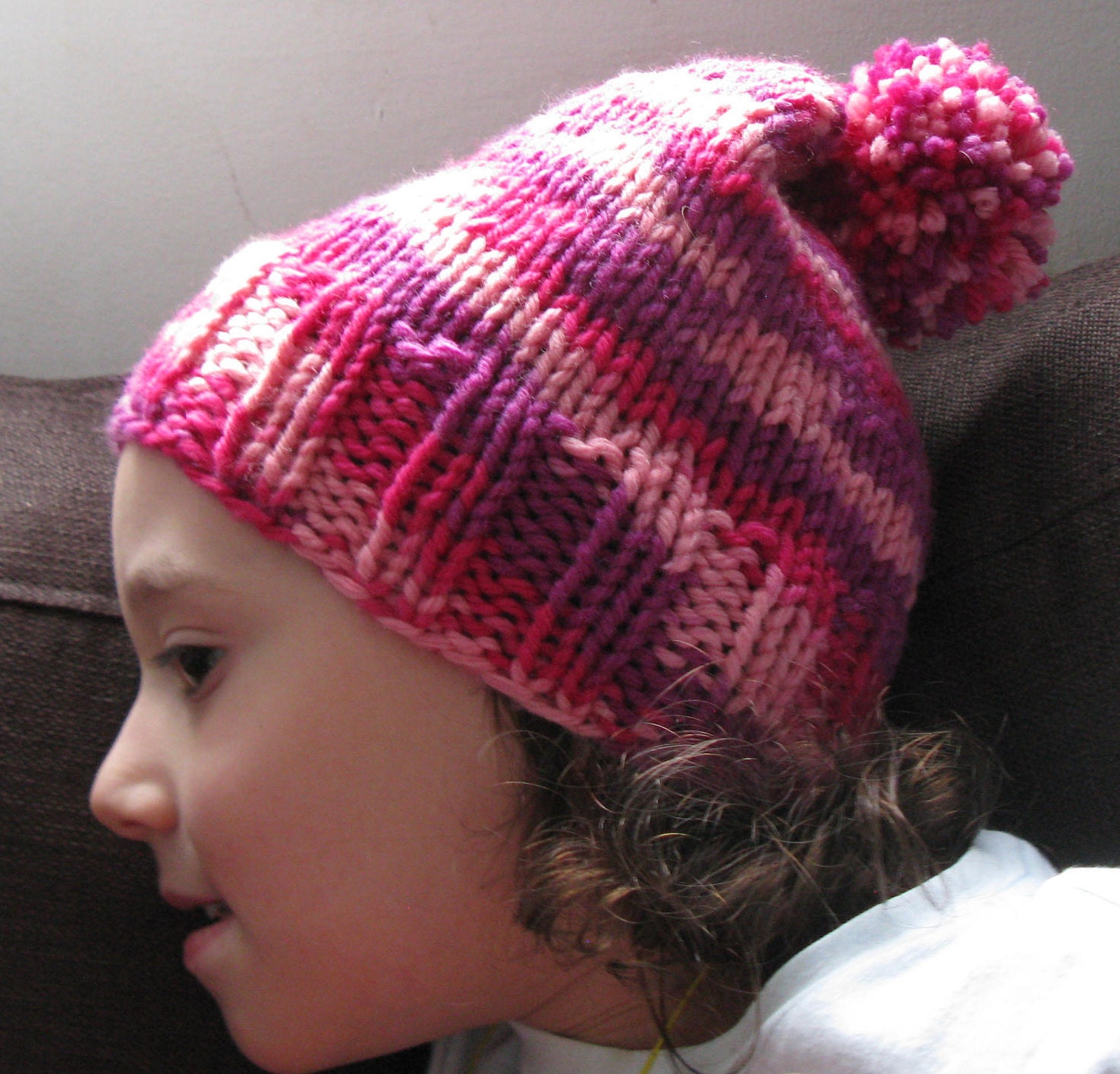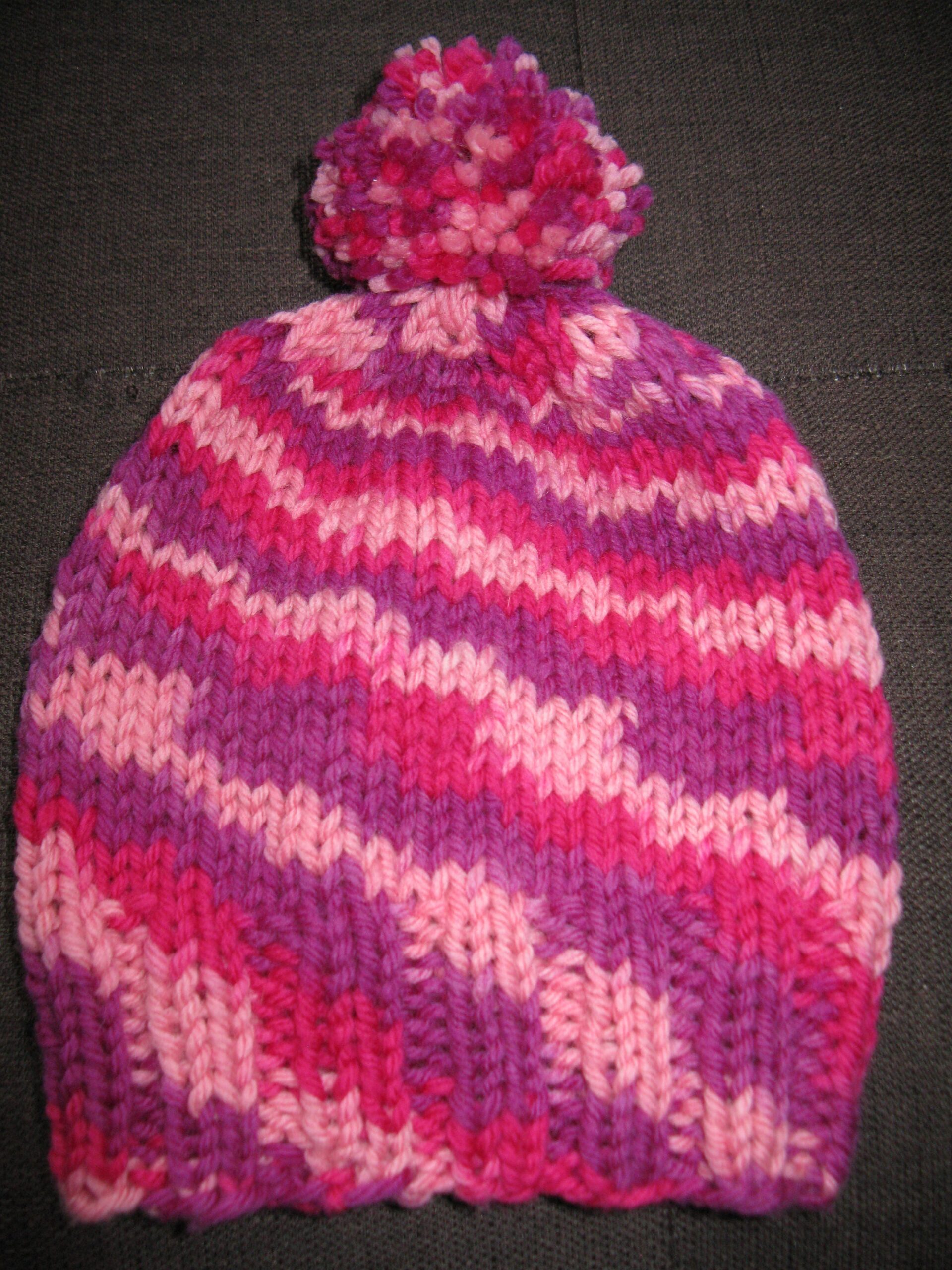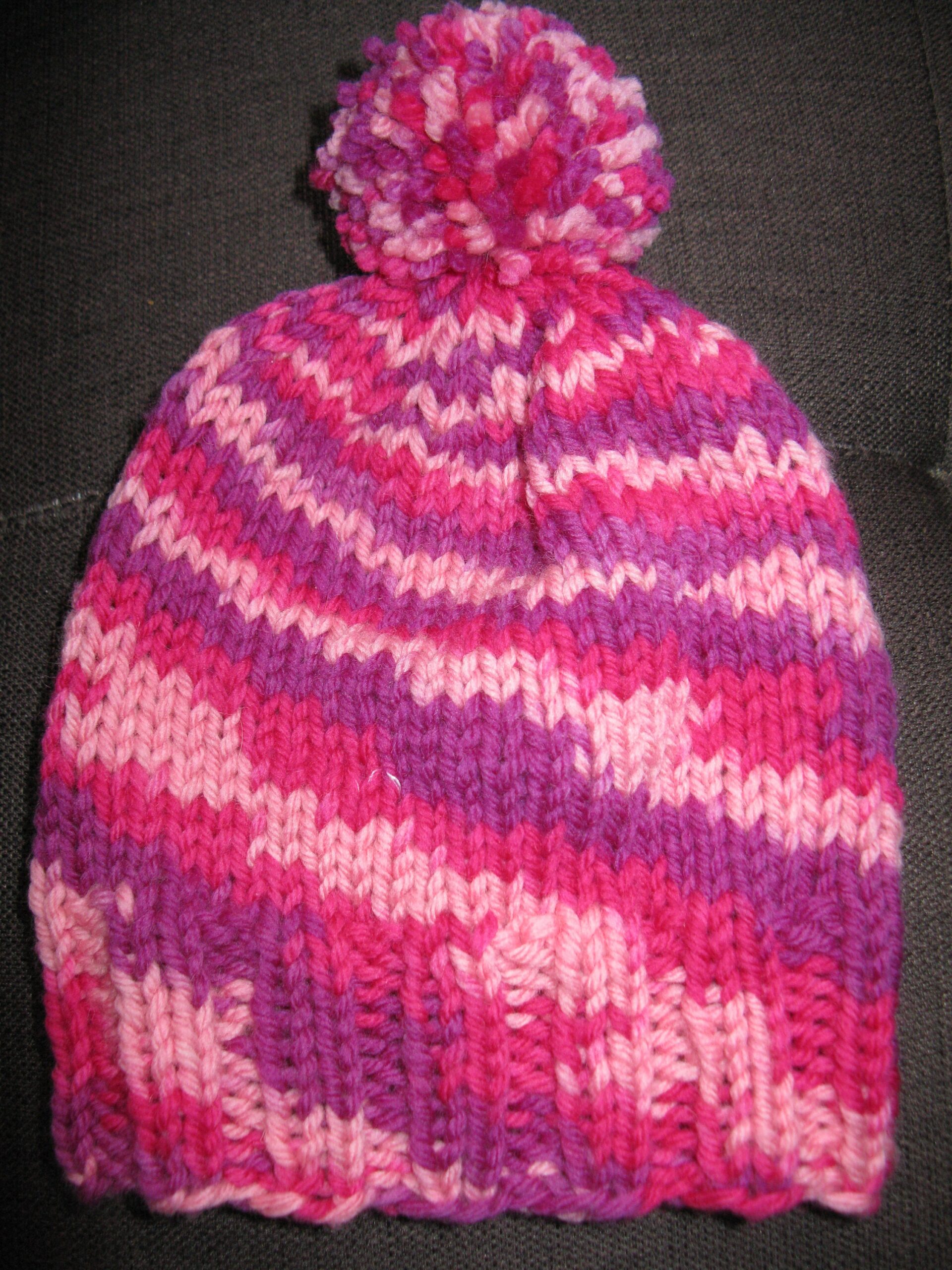 This hat is handknit from 100% wool in pinks and purple stripes that swirl. It fits a toddler to a small child and is slouchy. You can fold up the brim for a more fitted look. Handwash, lie flat to dry.