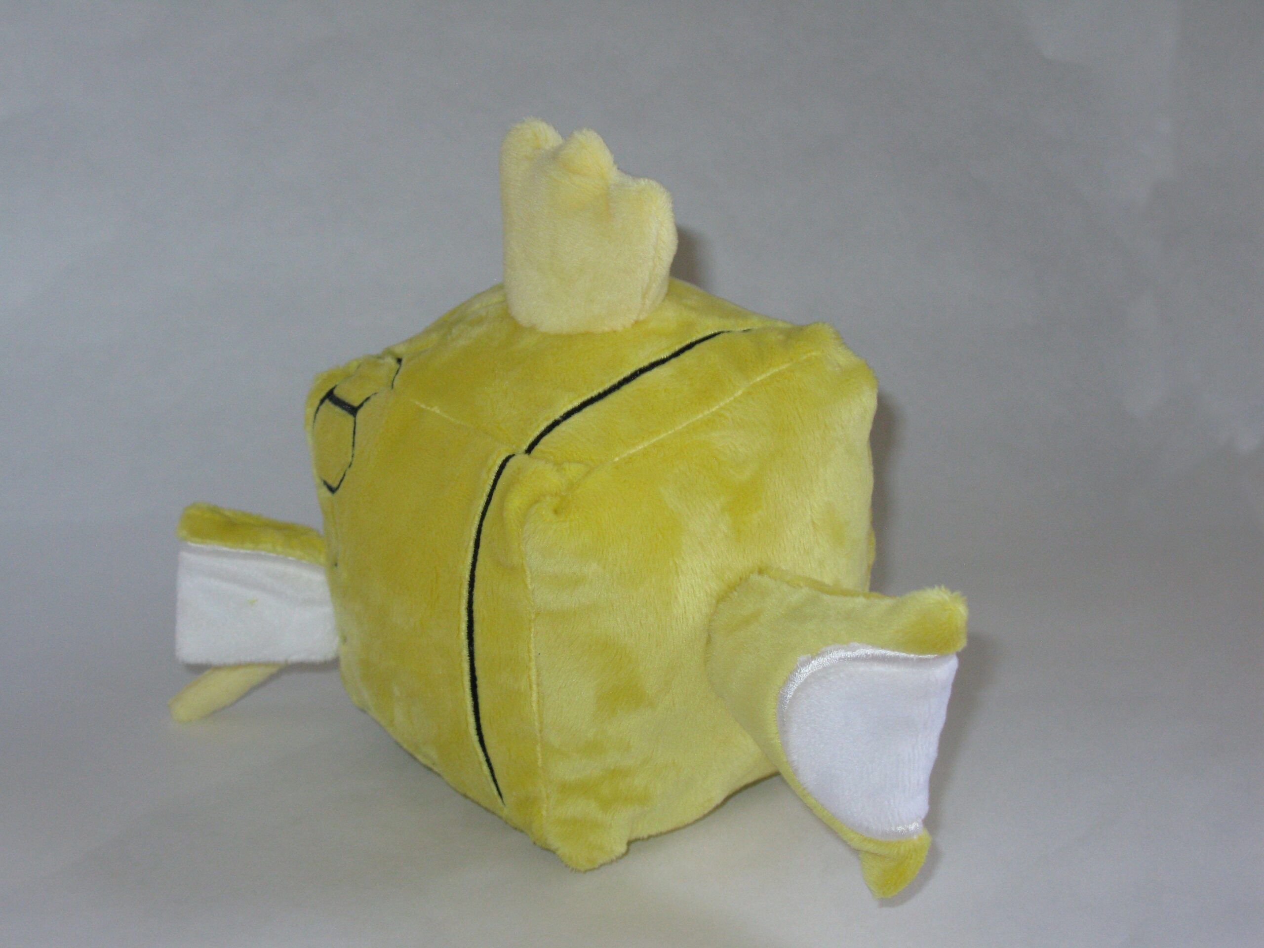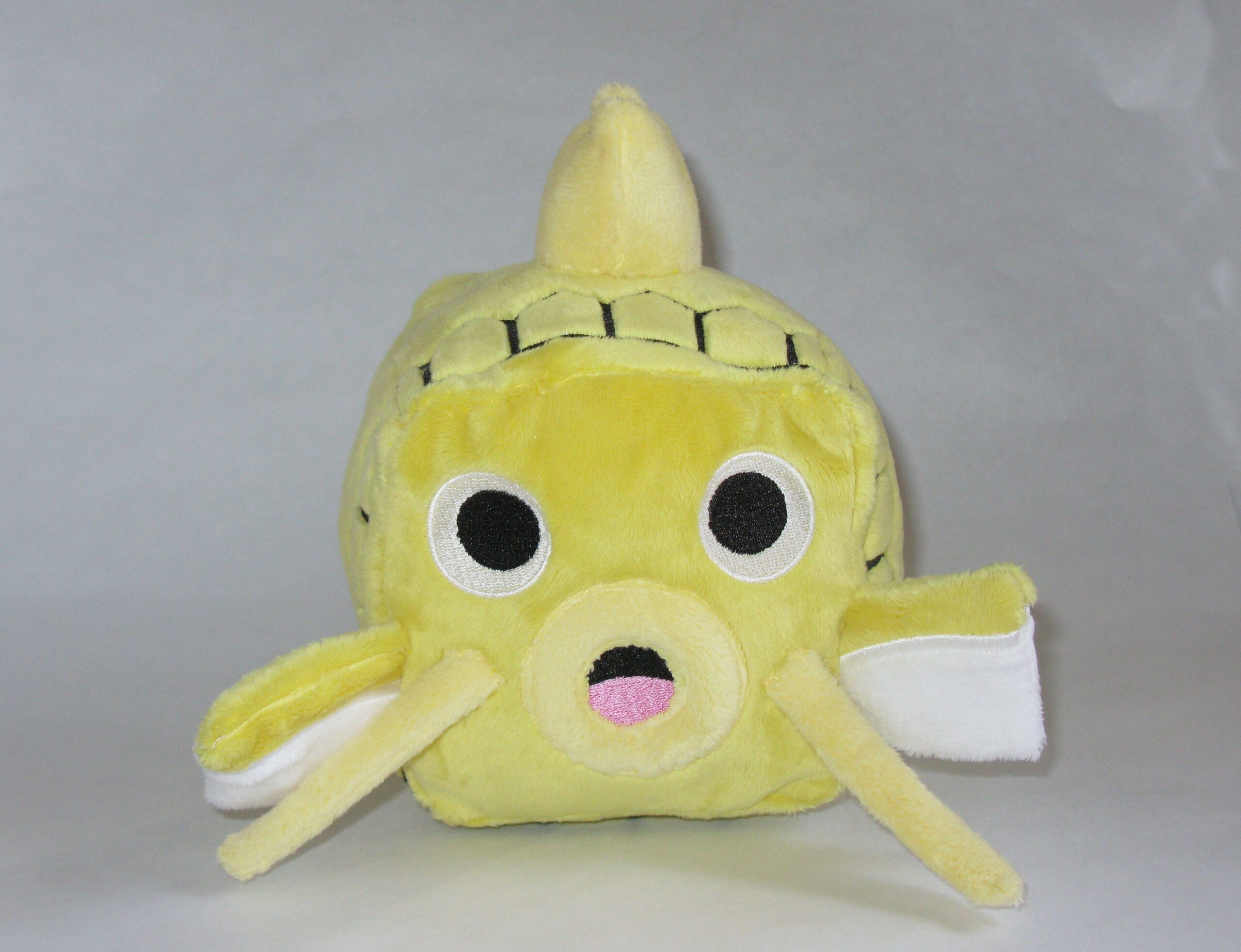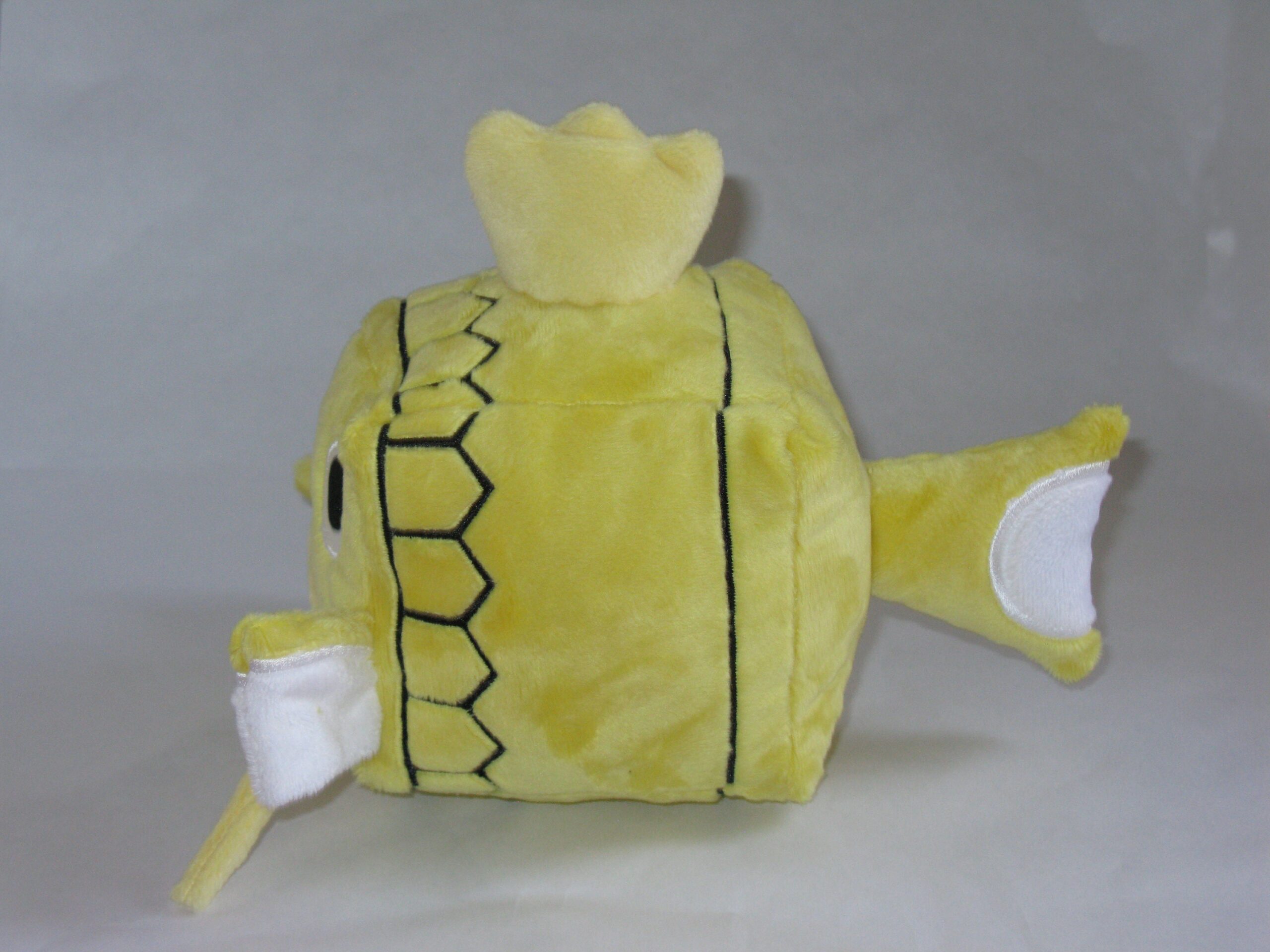 This shiny Magikarp cube is made with minky fabric and love, stuffed with polyfill, and has embroidered details. The cube is about 4.5 inches, and the fins stick out about 2 inches. It is ready to go. Pattern by Kuro Neko Embroidery Designs
